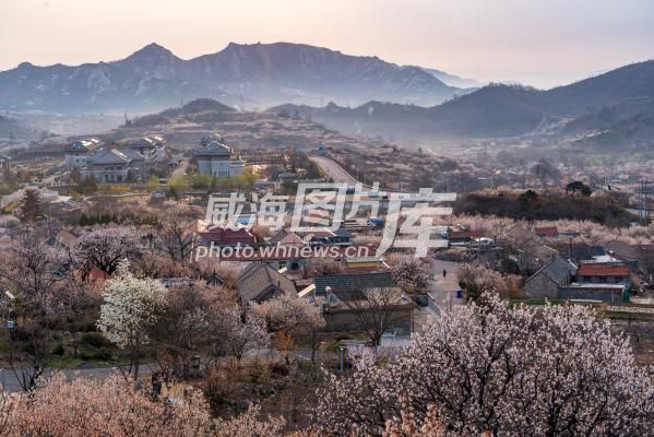 昆嵛山下,樱桃花开遍山野,村落错落其间,晨雾绕山,晨光初洒春日花乡。